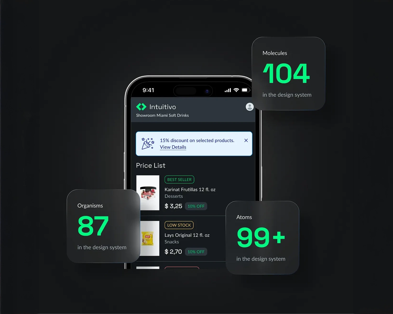 Co-created naming taxonomy (atoms → molecules → organisms) to mirror Brad Frost’s Atomic Design but tailored to Intuitivo.