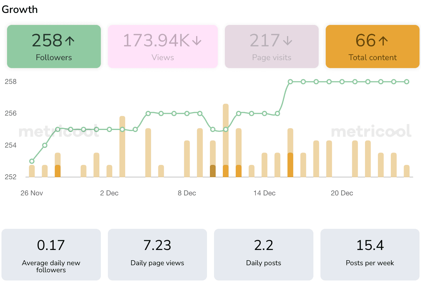 📈 +258 net followers, showing steady organic growth despite a small account base